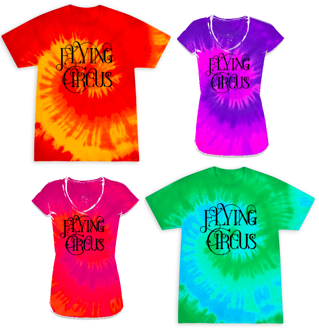 Die Shirts werden heute von der gleichen Manufaktur gefärbt, die auch die Batikshirts für das Burg Herzberg Festival macht und erhalten zusätzlich natürlich noch das aktuelle Flying Circus-Logo!